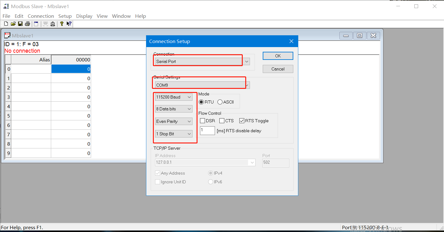 2、304串口使用USB轉串口線連接電腦,用modbusSlave模擬真實終端設備。