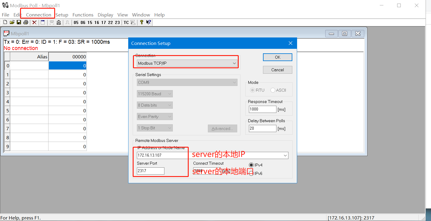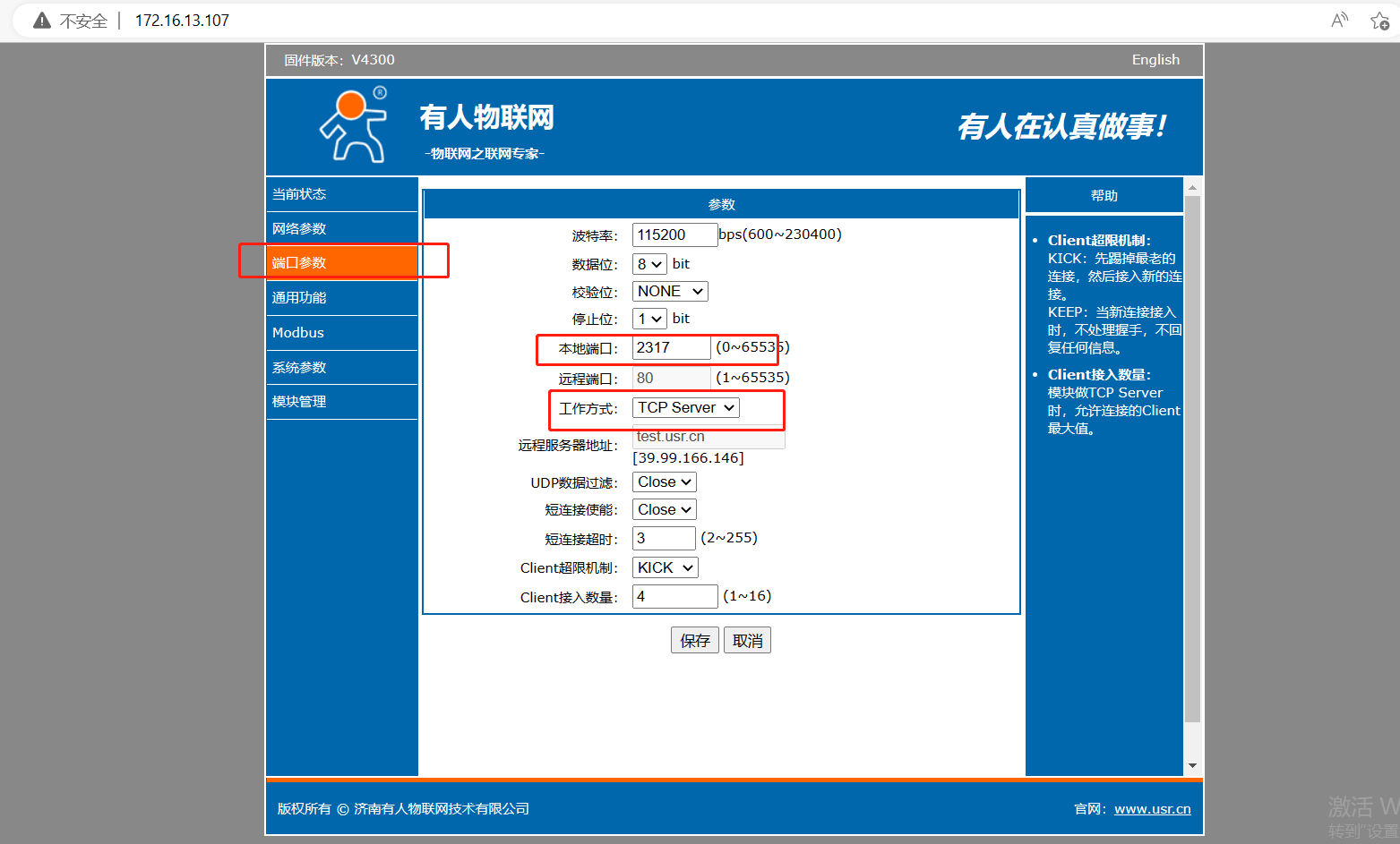 設置工作方式:TCPserver ,本地端口號:2317(自定義即可)