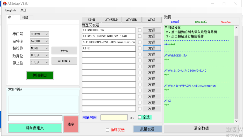 1、使用USB轉(zhuǎn)485的串口線,將設(shè)備與電腦進(jìn)行連接,在電腦的設(shè)備管理器中查看生成的端口號(hào),關(guān)閉電腦的防火墻,下載并打開(kāi)AT指令軟件,使用設(shè)備默認(rèn)的串口參數(shù)(115200 N 8 1)打開(kāi)串口。發(fā)送+++a進(jìn)入配置狀態(tài)。