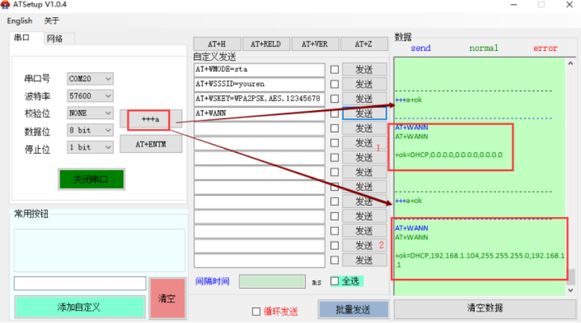 3、發(fā)送AT+Z重啟,點(diǎn)擊進(jìn)入配置狀態(tài),可以通過(guò)AT+WANN查詢路由器給設(shè)備分配的ip地址。