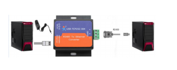 304(USR-TCP232-304,以下簡(jiǎn)稱 304 )設(shè)備使用直流穩(wěn)壓5V供電,網(wǎng)口使用網(wǎng)線連接到PC機(jī)網(wǎng)口,RS485轉(zhuǎn)USB調(diào)試線接PC機(jī)USB口