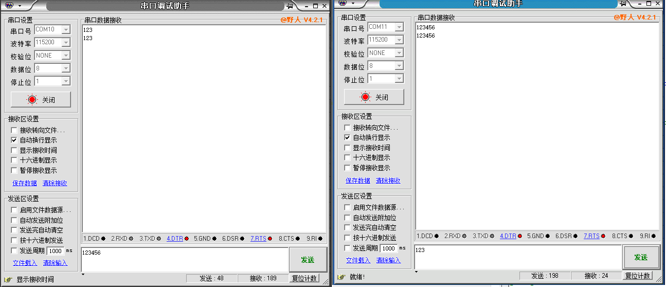 電腦打開2個串口調(diào)試助手軟件,打開兩個模塊對應(yīng)的USB-RS232/485串口線COM口號,發(fā)送端模塊串口發(fā)送數(shù)據(jù)透傳給接收端所有的設(shè)備。