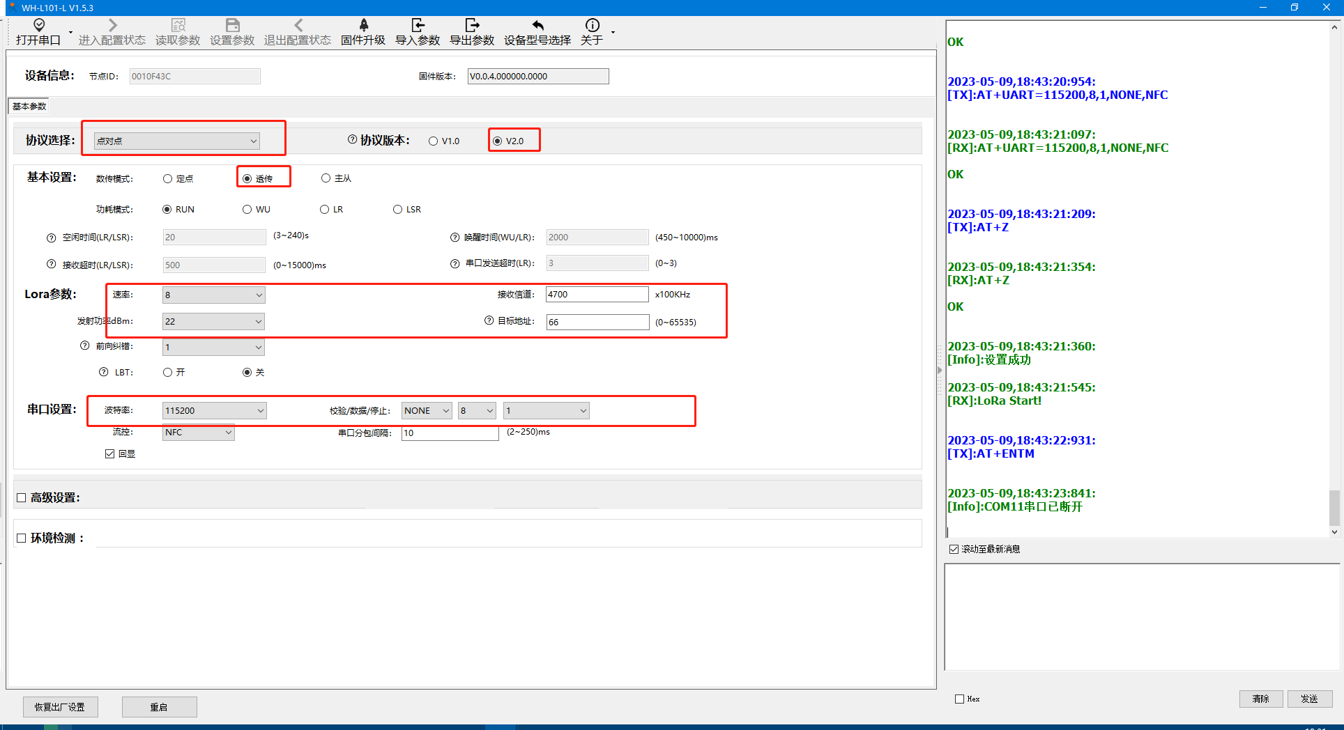 1、電腦下載并安裝WH-L101-L的設(shè)置軟件,選擇對應(yīng)的產(chǎn)品型號打開軟件。選擇對應(yīng)串口com10、com11,使用產(chǎn)品默認(rèn)的串口參數(shù)(115200 N 8 1)打開,點擊進(jìn)入配置狀態(tài)(返回a+ok說明成功進(jìn)入配置)然后讀取參數(shù)。