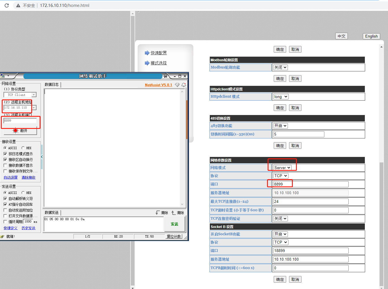 3、USB轉(zhuǎn)232的串口線接電腦,打開(kāi)一個(gè)串口調(diào)試助手模擬終端設(shè)備,可以看到串口和網(wǎng)絡(luò)端的數(shù)據(jù)正常通訊。
