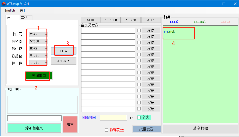 2、使用ATsetup 軟件,打開(kāi)對(duì)應(yīng)的串口,波特率數(shù)據(jù)位校驗(yàn)位本案例以出廠默認(rèn)參數(shù)為準(zhǔn)。發(fā)送+++a返回ok,即正確進(jìn)入AT指令模式。