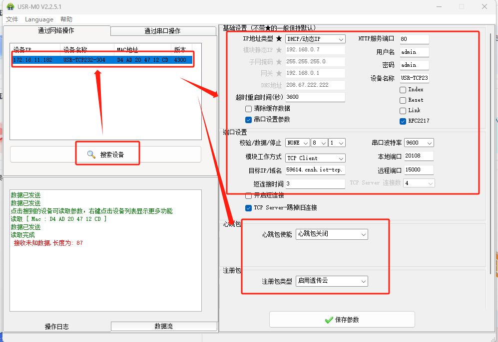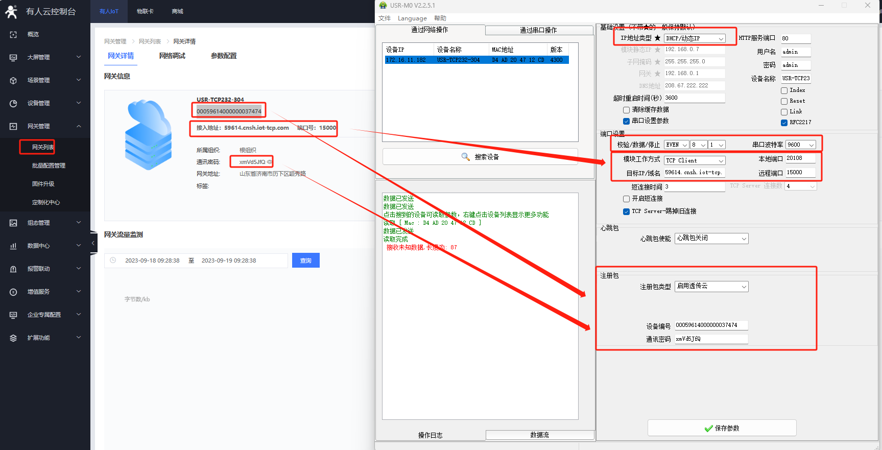 修改IP類型為DHCP(用戶根據(jù)自己網(wǎng)絡(luò)需求設(shè)置靜態(tài)IP或者DHCP),串口參數(shù)校驗位修改為偶校驗(電表出廠默認(rèn)校驗位為偶校驗,可以修改304校驗位,也可以修改電表校驗位,用戶按需修改即可)波特率9600,填入目標(biāo)IP和端口號以及注冊信息,點擊保存參數(shù),即可看到USR-TCP232-304在有人云端上線。
