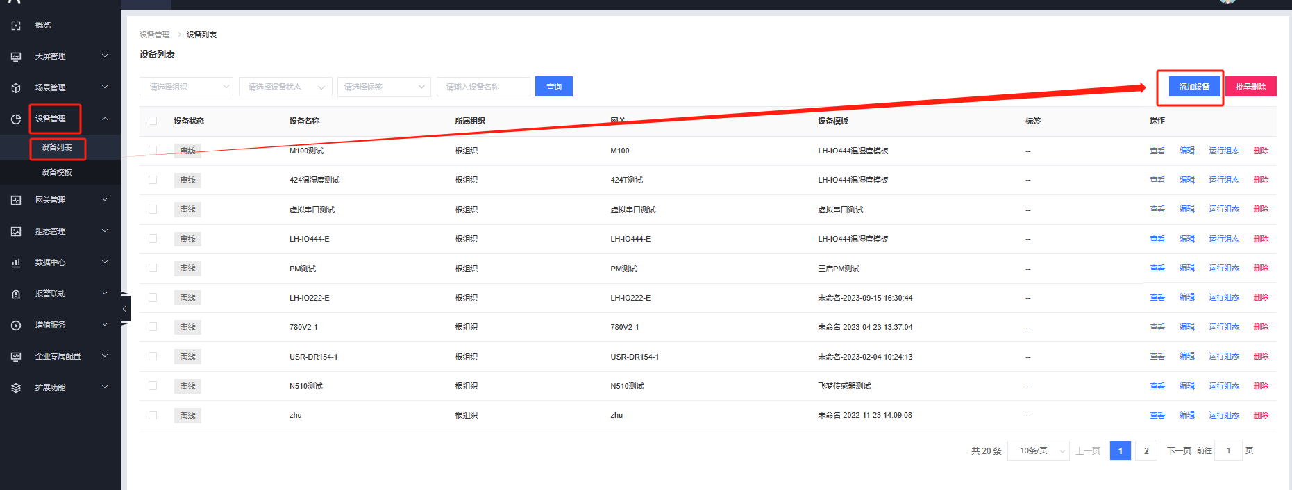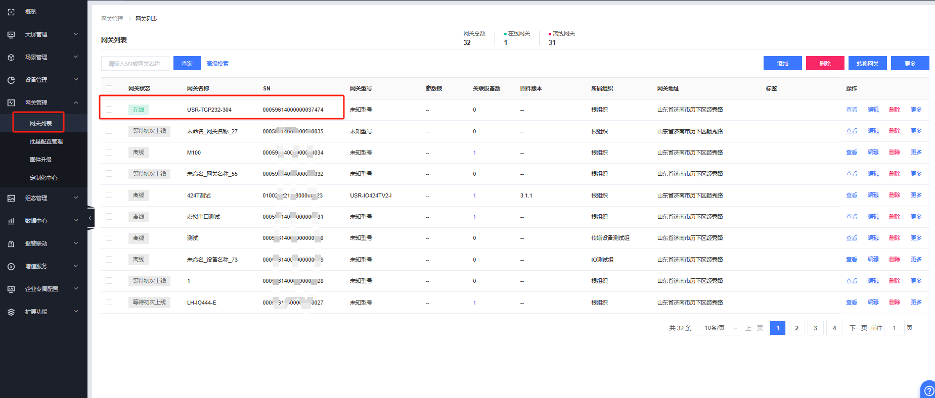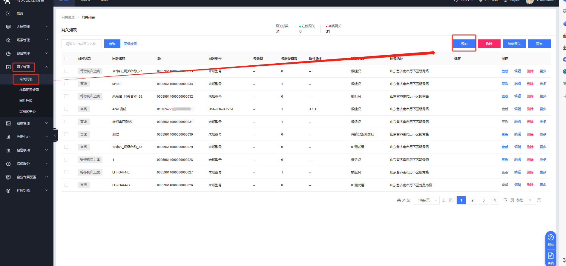 2.添加網(wǎng)關(guān)設(shè)備: 網(wǎng)關(guān)管理-網(wǎng)關(guān)列表-添加-單個添加,填寫設(shè)備名稱,選擇設(shè)備組織,選擇“SN不支持,點這里”,點擊保存即可,獲取到系統(tǒng)分配的接入地址和ID密碼