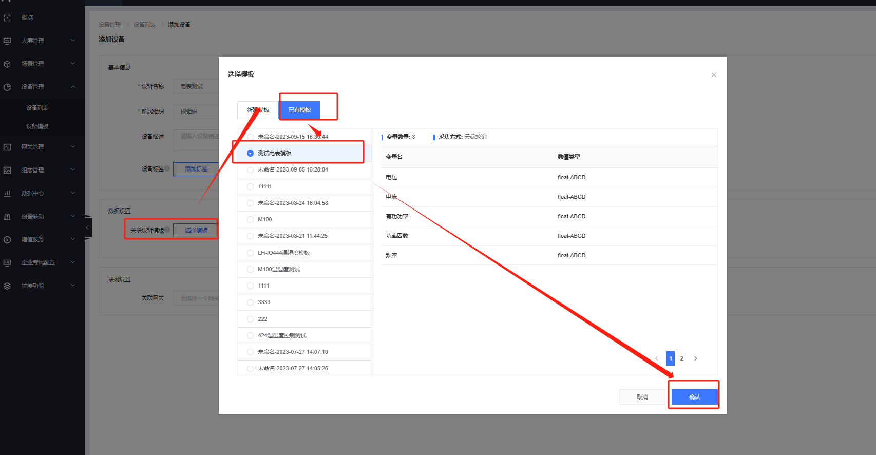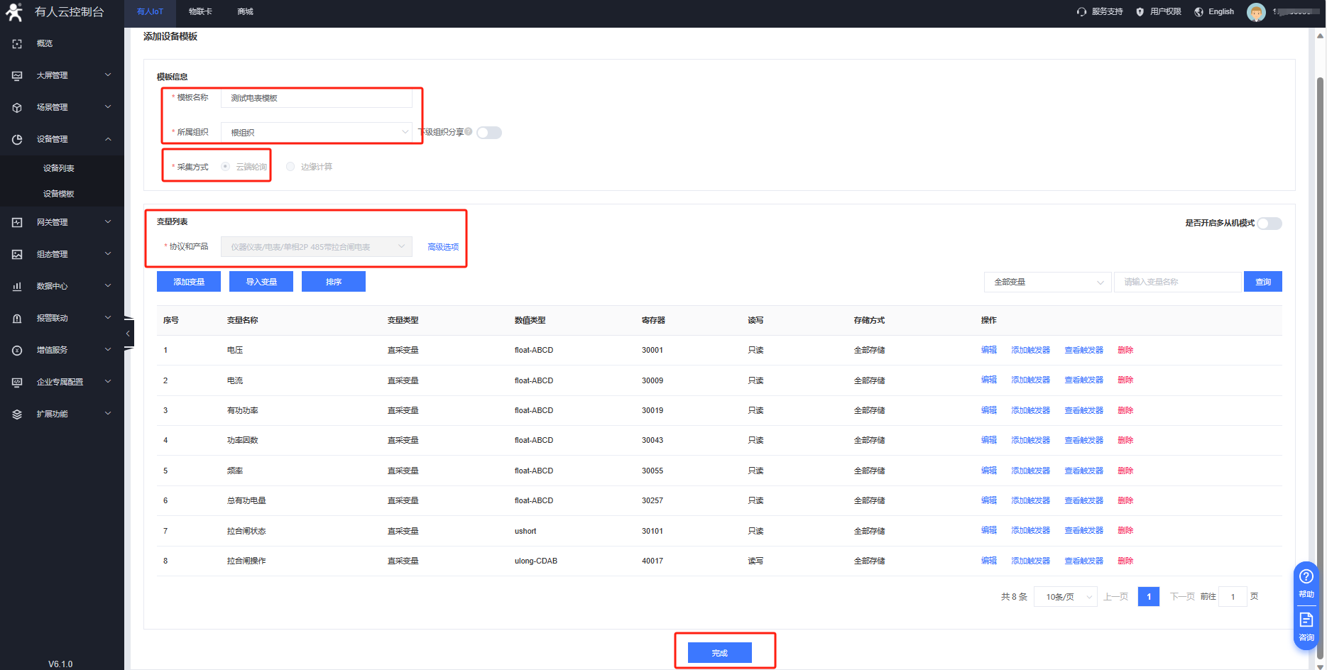 設(shè)備管理--設(shè)備模板--添加,填入模板名稱、組織采集方式選擇云端輪詢(304不支持邊緣計算功能),朗漢德是有人生態(tài)產(chǎn)品,所以直接從系統(tǒng)產(chǎn)品里面選擇模板即可