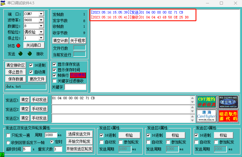 5.使用USB轉(zhuǎn)485轉(zhuǎn)換器,接到電表485端口上,串口參數(shù)選擇9600 E 8 1,打開串口,發(fā)送讀取電壓的modbus rtu報文,測試電表通訊是否正常。(電表出廠默認(rèn)地址1,可修改)讀到電壓235.3V.