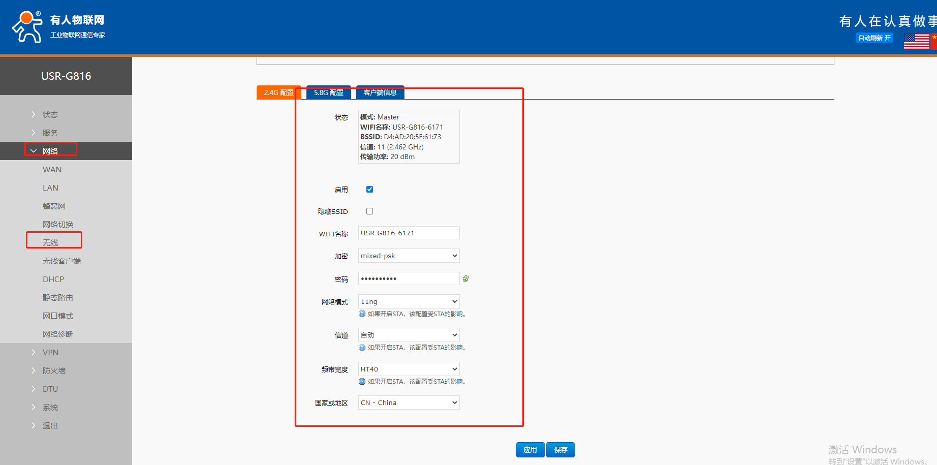 打開網(wǎng)絡(luò)--無線,816的AP配置如圖,可按照需求修改相關(guān)內(nèi)容。修改完后點(diǎn)應(yīng)用生效。