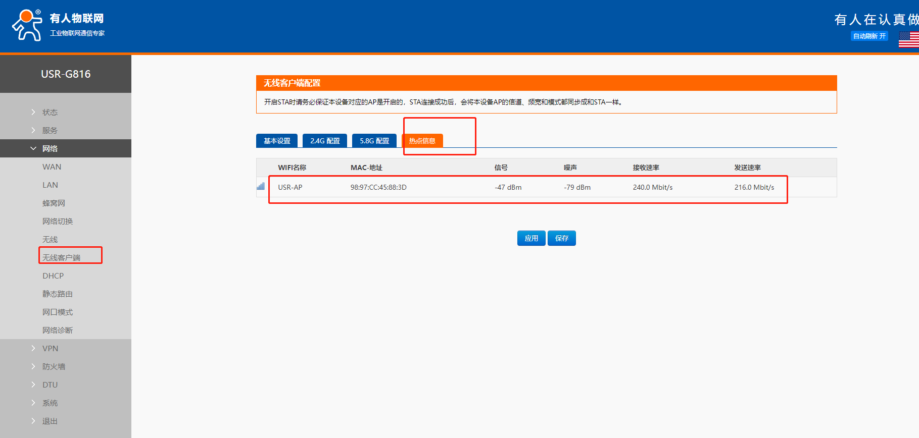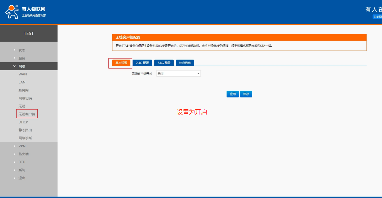 進(jìn)入網(wǎng)絡(luò)--無線客戶端,啟用無線客戶端(STA),此功能默認(rèn)關(guān)閉??梢渣c(diǎn)擊搜索按鈕,搜索當(dāng)前 2.4G WIFI 熱點(diǎn)。也可以直接填寫wifi名稱等,設(shè)置完成后點(diǎn)應(yīng)用。