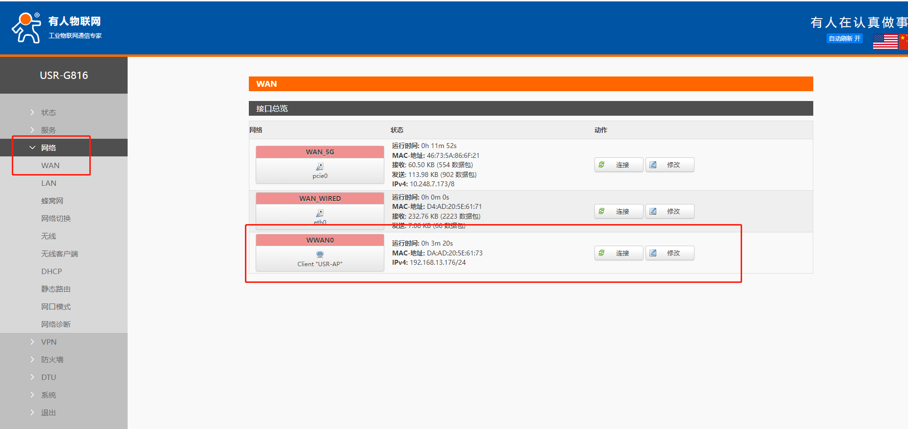 也可以從網(wǎng)絡(luò)--WAN,查看連接信息。