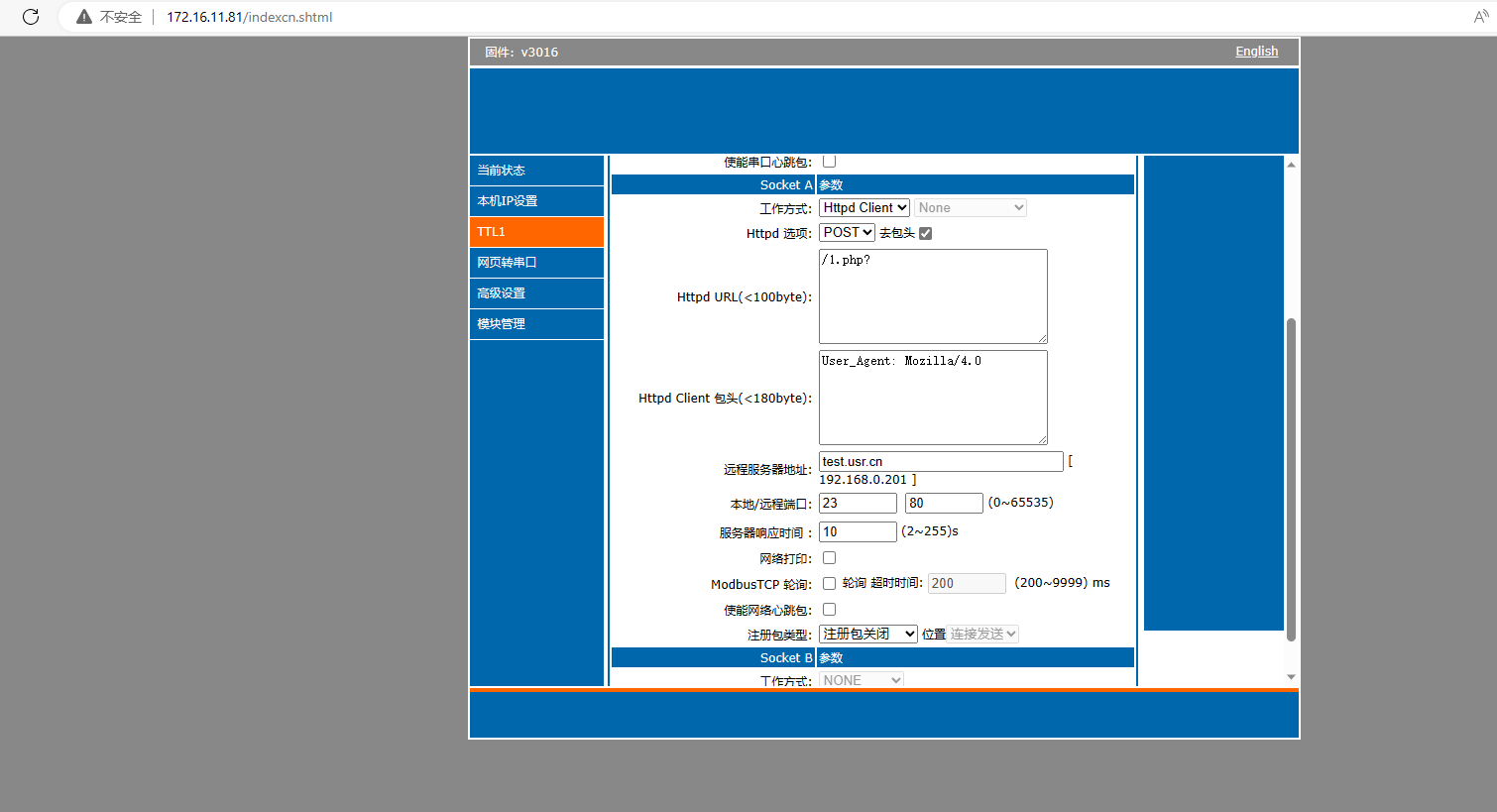 6. 在谷歌瀏覽器輸入IP 172.16.11.81,打開k7內(nèi)置網(wǎng)頁,用戶名密碼都為admin。模塊設(shè)置為Httpd Client模式,請(qǐng)求方式POST,URL為/2.php,設(shè)置服務(wù)器地址test.usr.cn,端口80,設(shè)置并保存所有參數(shù),重啟模塊。(本說明文檔使用為有人測(cè)試服務(wù)器)
