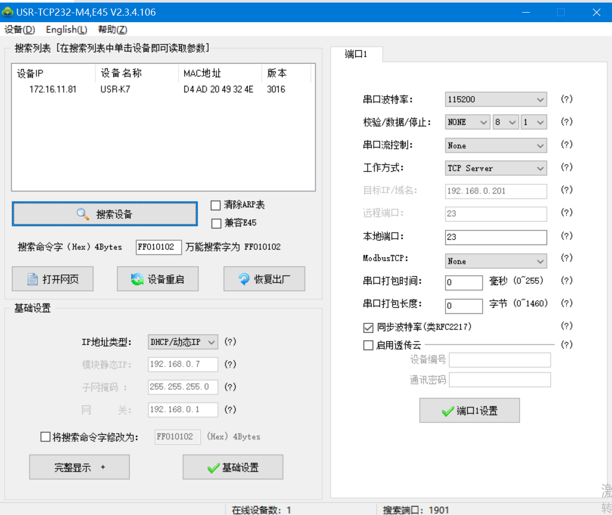 3. 打開M4設(shè)置軟件,點(diǎn)擊搜索設(shè)備,可看到搜索到的設(shè)備,點(diǎn)擊選中,可看到IP地址類型為靜態(tài)IP
