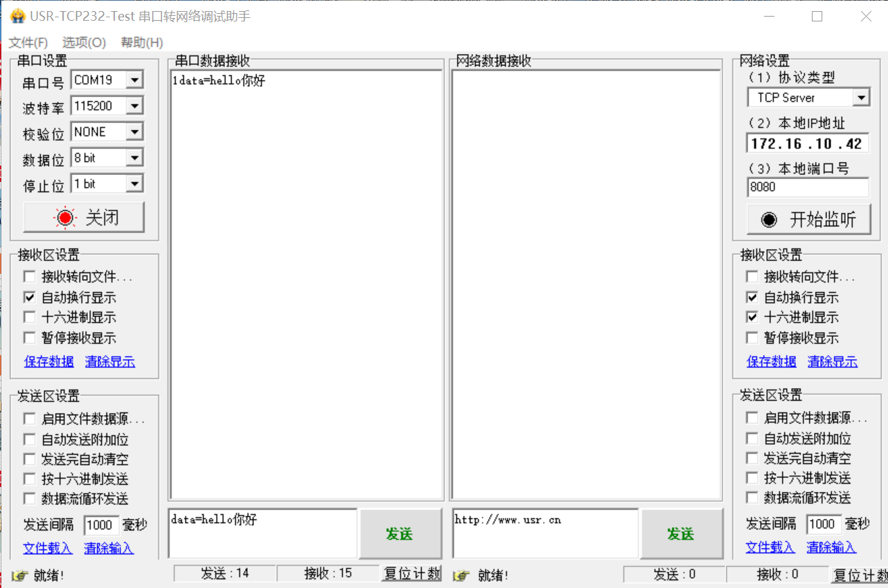 7. 打開串口,串口參數(shù)和K7的串口參數(shù)保持一致,發(fā)送data=hello你好,返回?cái)?shù)據(jù):data=hello你好