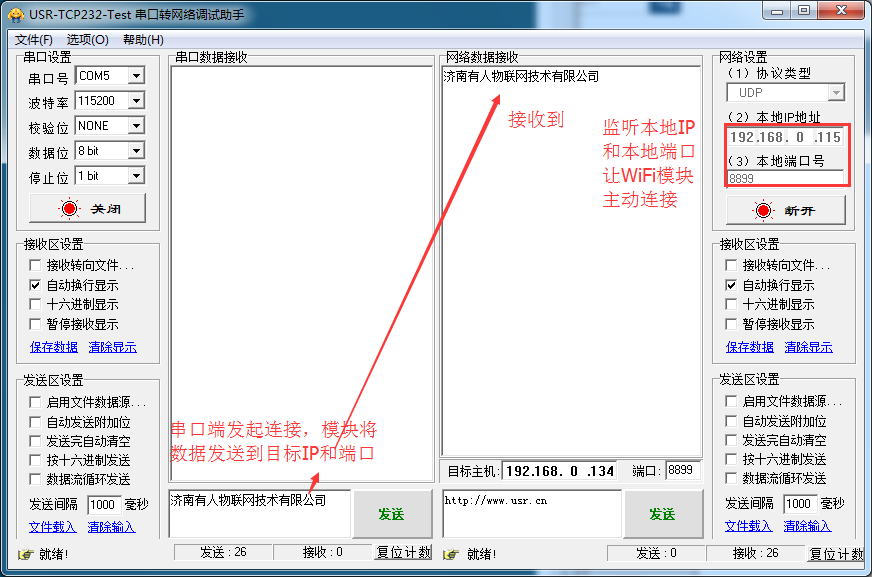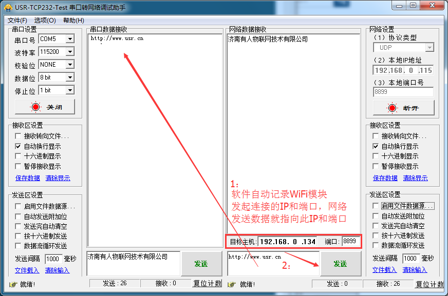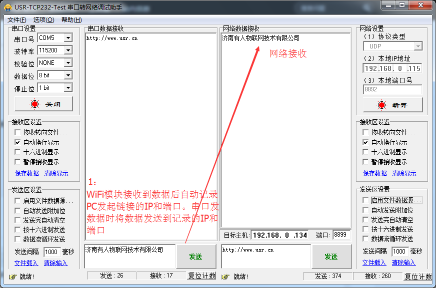 1:協(xié)議設(shè)置為UDP-client Socka 服務(wù)器地址和端口 設(shè)置為電腦的IP和電腦測試軟件的本地端口號。設(shè)置完成后重啟WiFi模塊
