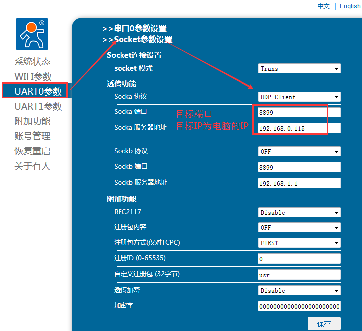 1:進(jìn)入配置網(wǎng)頁,設(shè)置socka協(xié)議為UDP server,UDP server端口8899 。socka服務(wù)器地址可以設(shè)置為電腦的IP,這個(gè)服務(wù)器地址是代表WiFi模塊串口接收到數(shù)據(jù)后,將數(shù)據(jù)發(fā)送到網(wǎng)絡(luò)端,如果模塊沒有記錄來源IP和端口的話,模塊自動(dòng)將數(shù)據(jù)發(fā)送到服務(wù)器地址和socka端口。設(shè)置完成后重啟WiFi模塊