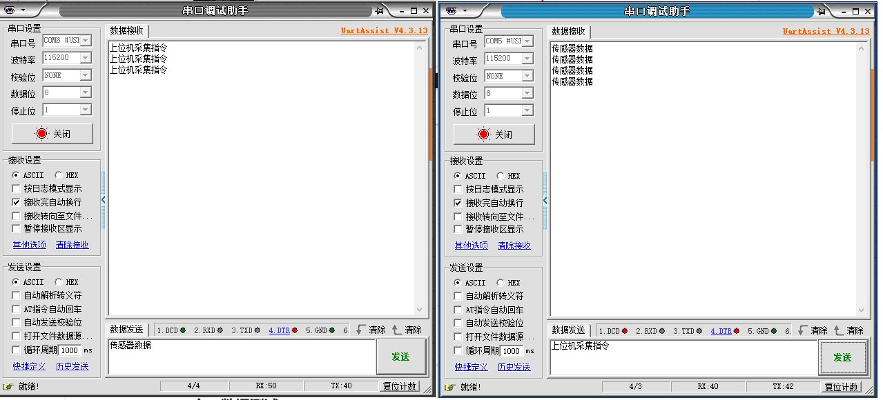 在電腦上打開兩個串口助手的測試軟件,分別去調(diào)用設備管理器中生成的端口。此案例中使用com6的串口助手模擬的傳感器數(shù)據(jù)。使用com5模擬的上位機??梢钥吹缴衔粰C與傳感器的數(shù)據(jù)交互。