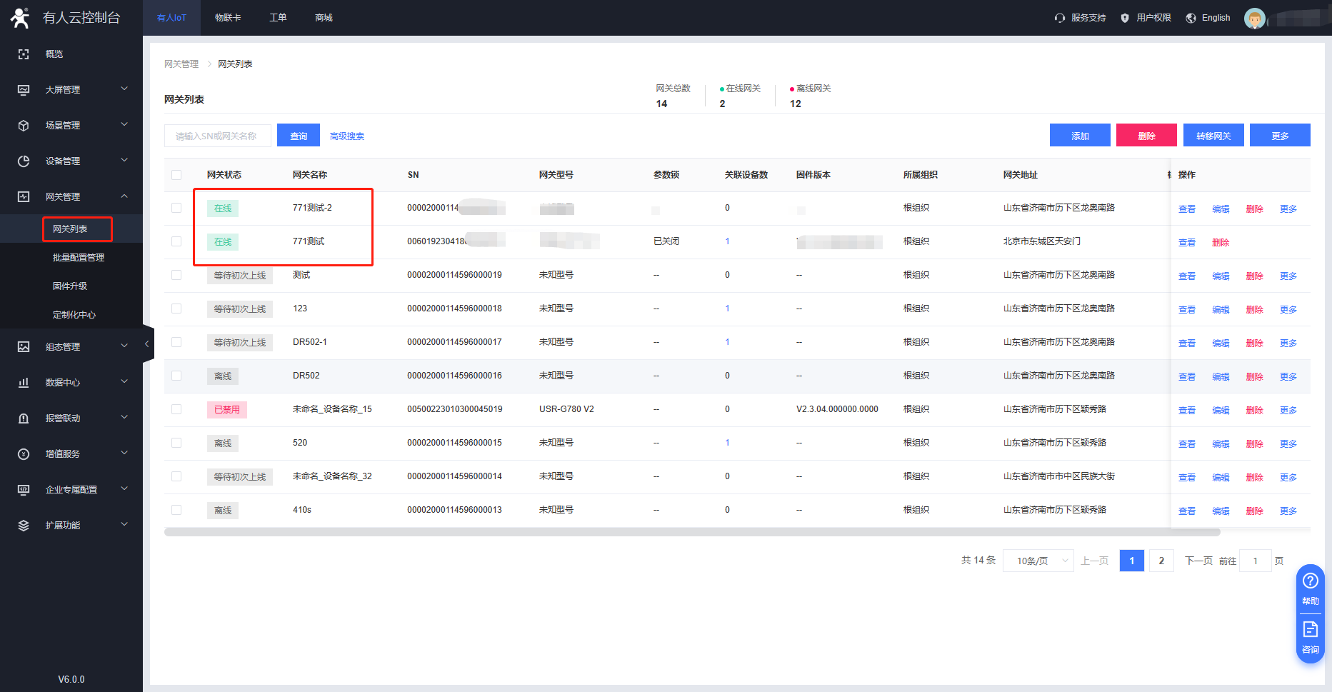 在網(wǎng)關管理---網(wǎng)關列表可以看到我們掃碼添加的兩臺G771設備,如果設備目前處于離線狀態(tài),可以檢查一下設備自身是否可以正常聯(lián)網(wǎng)。在設備正常聯(lián)網(wǎng)狀態(tài)下可以重啟下設備,可以看到設備的在線信息。