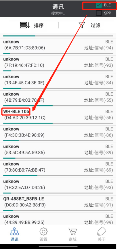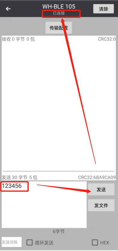 2、打開手機下載FeasyBlue藍(lán)牙app,點擊右上角BLE模式,搜索藍(lán)牙WH-BLE105,點擊連接。10秒內(nèi)發(fā)送密碼123456,建立連接。