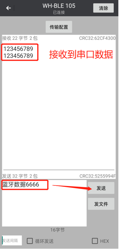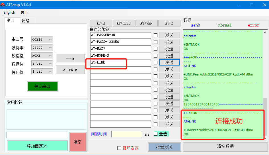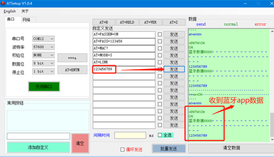 4、查詢藍(lán)牙連接成功后,點擊AT+ENTM進(jìn)入通信狀態(tài)下,可以互相發(fā)數(shù)據(jù)測試互通。
