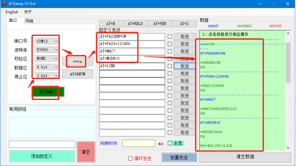 1、模塊焊接在EVK評估板上供電,串口接232轉(zhuǎn)usb到電腦,在設(shè)備管理器上會生成一個com12口,打開AT指令設(shè)置軟件,打開藍(lán)牙模塊默認(rèn)的參數(shù):波特率 57600、無校驗、8 位數(shù)據(jù)位、1 位停止位。 點擊“+++a”,返回“+ok”后,說明模塊進(jìn)入AT指令模式,可以發(fā)送AT指令設(shè)置參數(shù)。