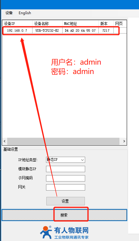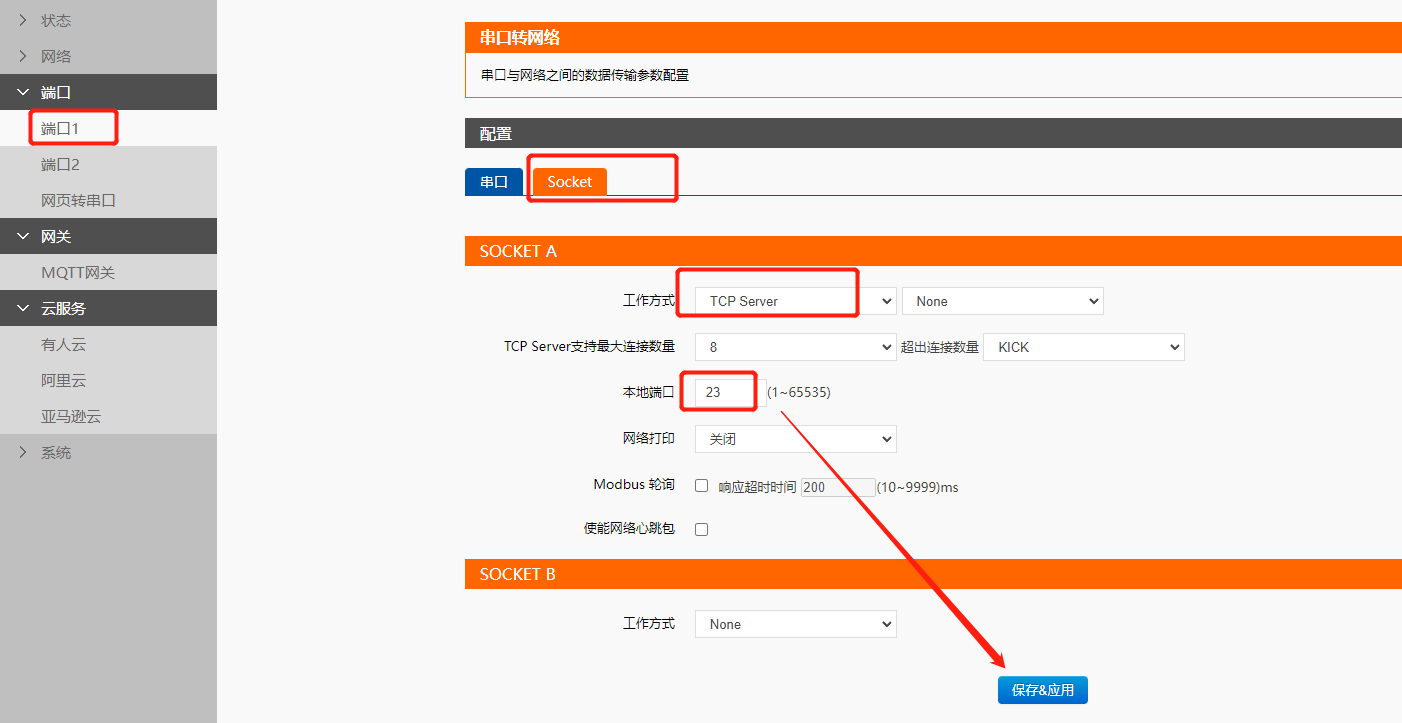 點(diǎn)擊“搜索設(shè)備”當(dāng)搜索列表中出現(xiàn)E2的設(shè)備后,單擊搜索到的設(shè)備,查看其配置信息,設(shè)置模塊的ip,串口參數(shù)跟終端保持一致,Socket工作方式選擇Tcp server,本地端口23,點(diǎn)擊端口設(shè)置保存參數(shù)。