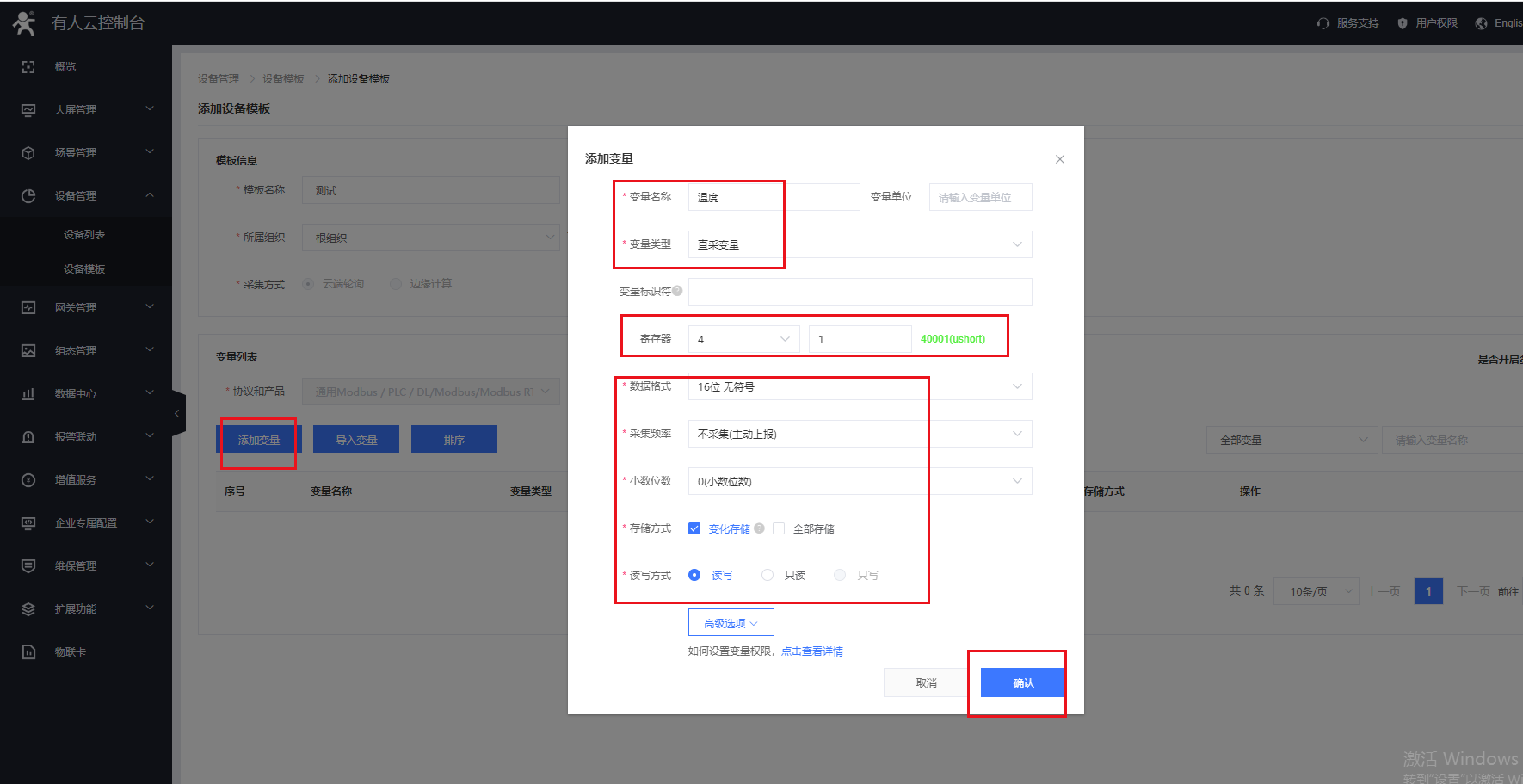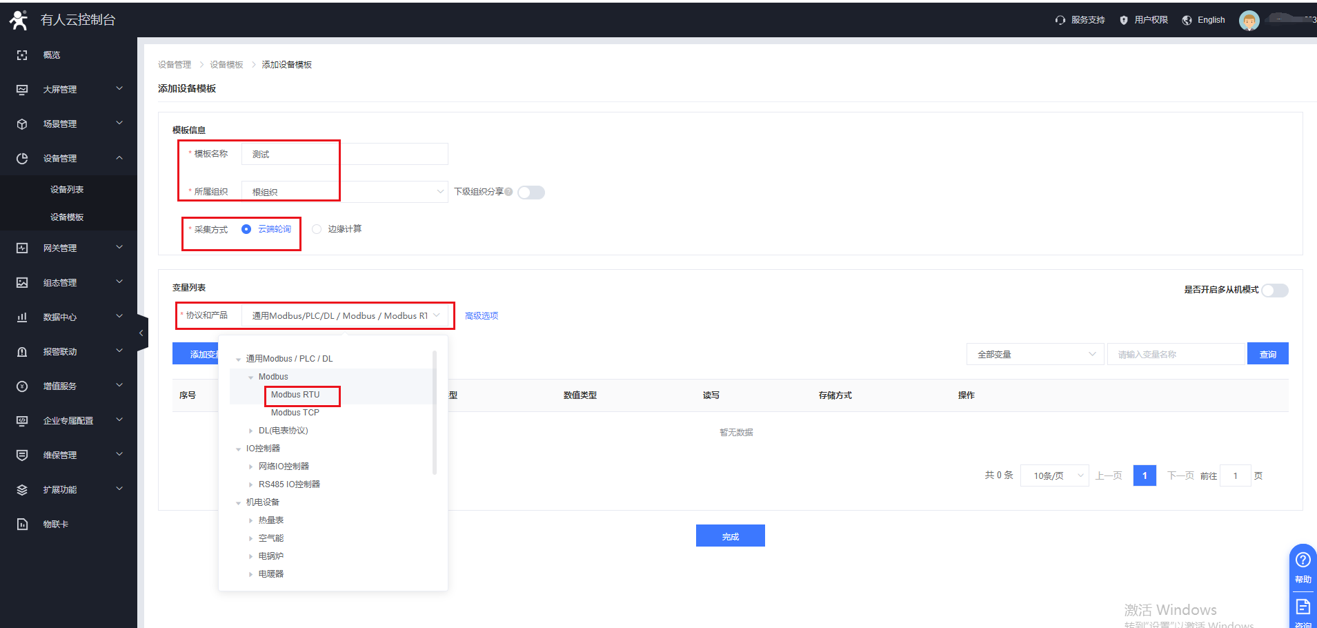 3.設(shè)備管理——設(shè)備模板,添加模板,選擇云端輪詢,modbus rtu協(xié)議,測試從機(jī)地址為1,寄存器為40001,選擇不采集,主動上報,配置完確認(rèn),完成。