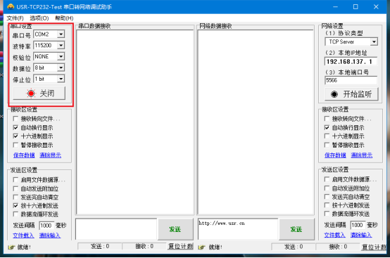 2、在串口調(diào)試助手打開虛擬串口創(chuàng)建的串口號;虛擬串口的波特率等參數(shù)是自適應(yīng)的,這里可以不用設(shè)置