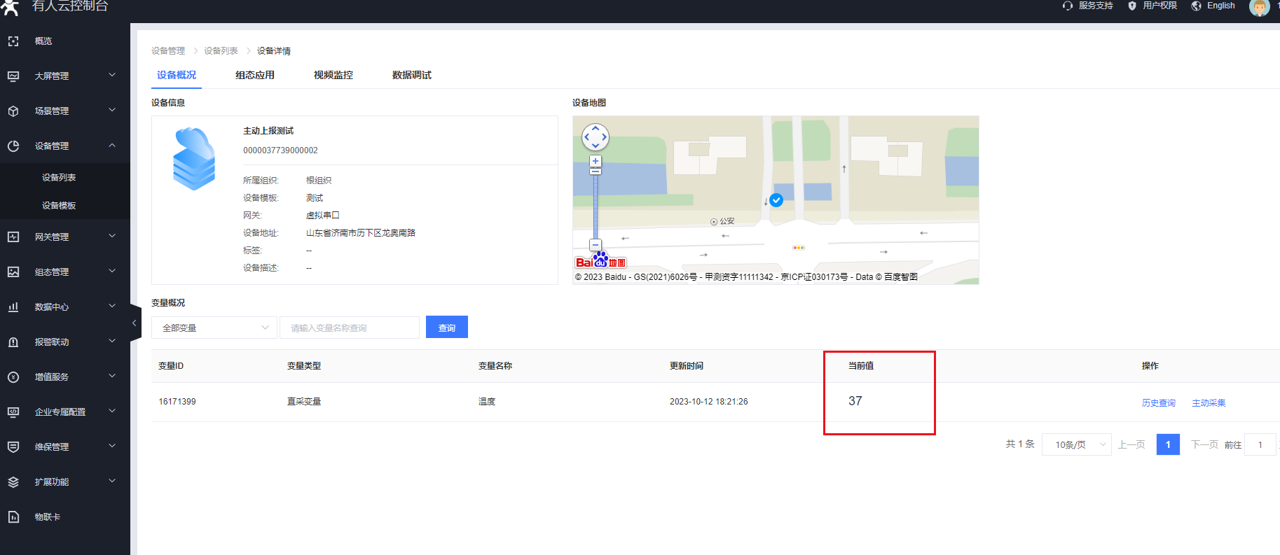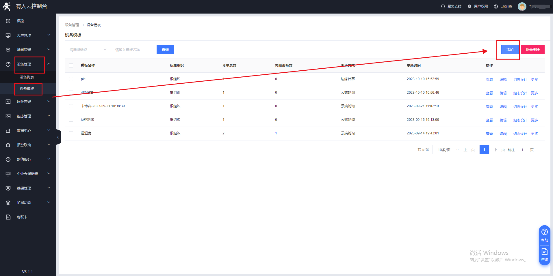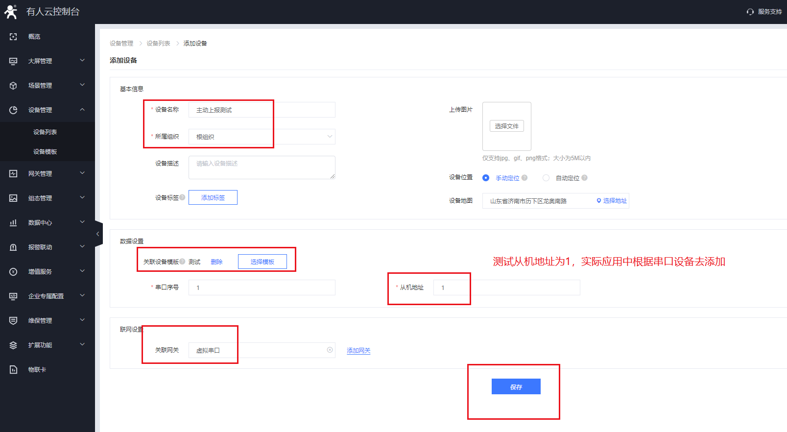4、設(shè)備管理——設(shè)備列表——添加設(shè)備,關(guān)聯(lián)添加的網(wǎng)關(guān)虛擬串口(實際應(yīng)用中是DTU)和模板