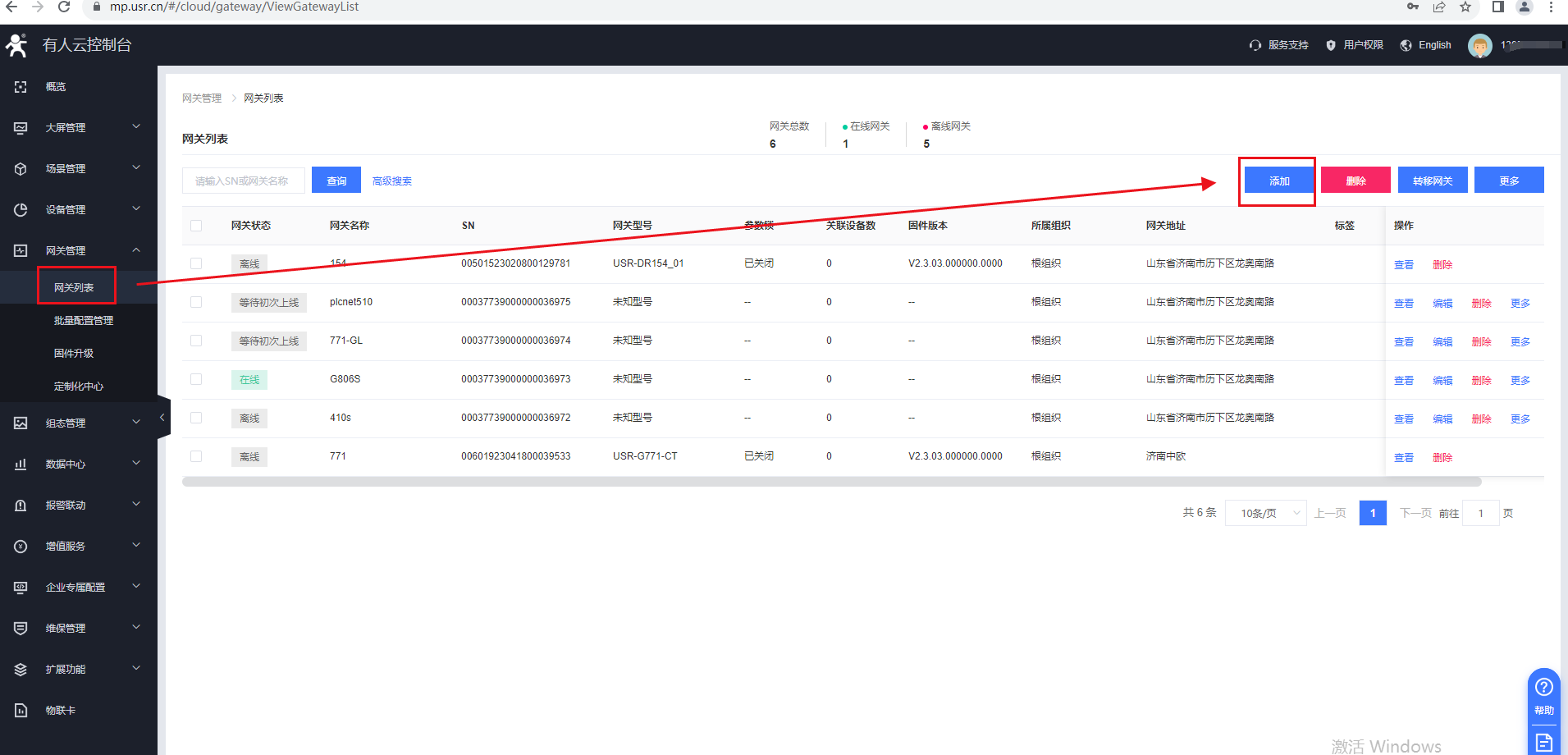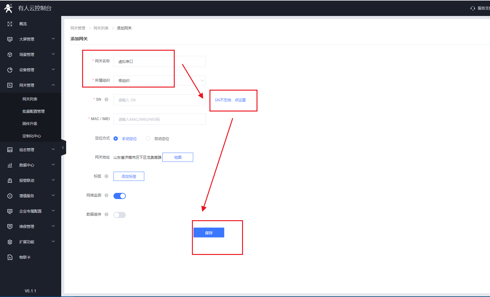 在網(wǎng)關(guān)管理——網(wǎng)關(guān)列表——添加網(wǎng)關(guān),自定義設(shè)備名稱與項目分組——點擊sn不支持,點這里(特別注意)