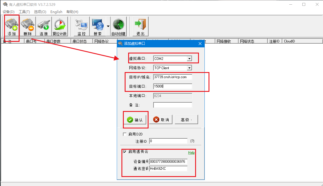 1、創(chuàng)建虛擬串口,連接云端添加網(wǎng)關(guān)生成的接入地址和端口,以及sn和密碼