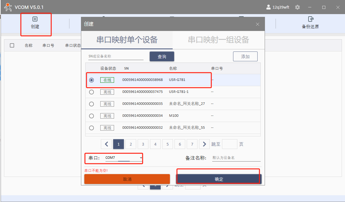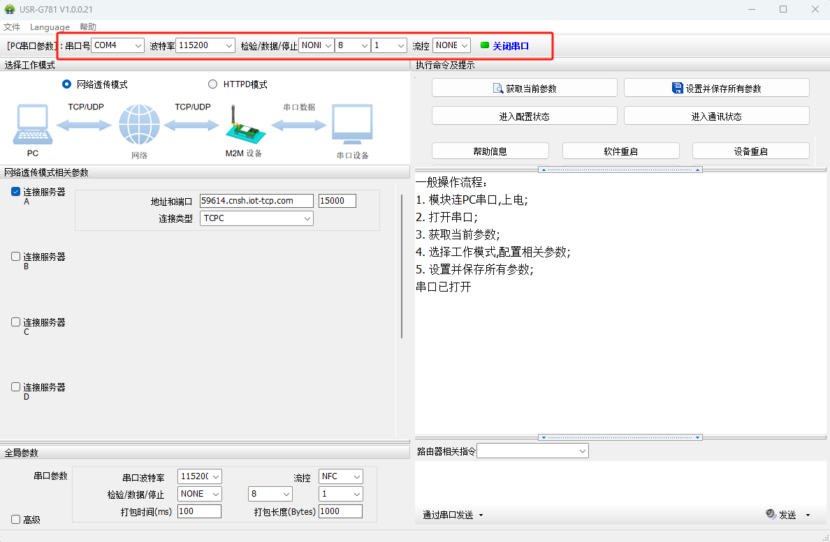 使用USB轉(zhuǎn)485轉(zhuǎn)換器接到電腦上,打開USR-G781配置軟件,從設(shè)備管理器中查看當(dāng)前COM口4,軟件選擇COM4