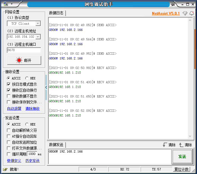 PC2即806w(B)的內網(wǎng)電腦,打開網(wǎng)絡調試助手,做tcp clinet端,IP設置806(A)獲取到的4G專網(wǎng) IP,端口設置為端口轉發(fā)的外部端口。能夠連接到 4G 路由器下的 TCP Server 并進行通信。