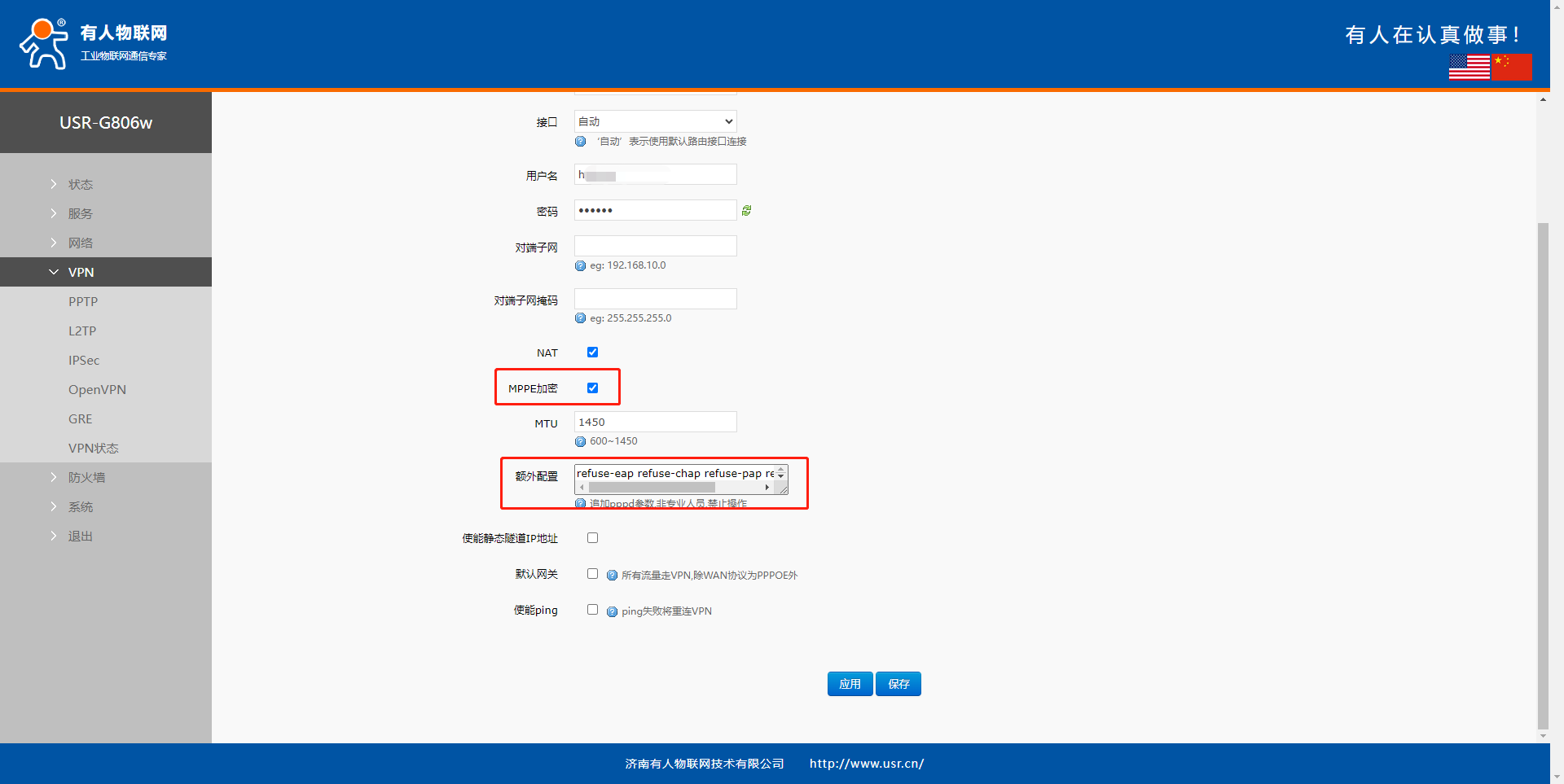 4>.加密方式與VPN服務器對應,其中加密方式可選:mppe stateful有狀態(tài)連接:會進行頻繁更換密鑰,且在更換密鑰時會出現(xiàn)嚴重丟包;mppe stateless無狀態(tài)連接:只有在丟包的時候會進行密鑰更改;no mppe服務端無 MPPE 加密方式時選擇此模式。額外配置:當以上配置不滿足配置文件和服務端向匹配時在此添加附加配置。例如服務端 MPPE 認證方式 為 only mschapV2,G806W 可在額外配置內添加 refuse-eap refuse-chap refuse-pap refuse-mschap 配置
