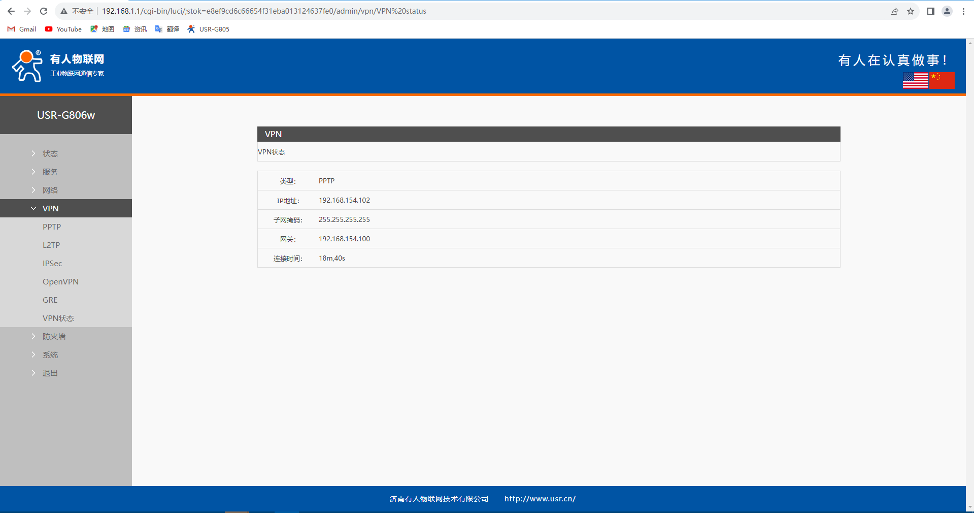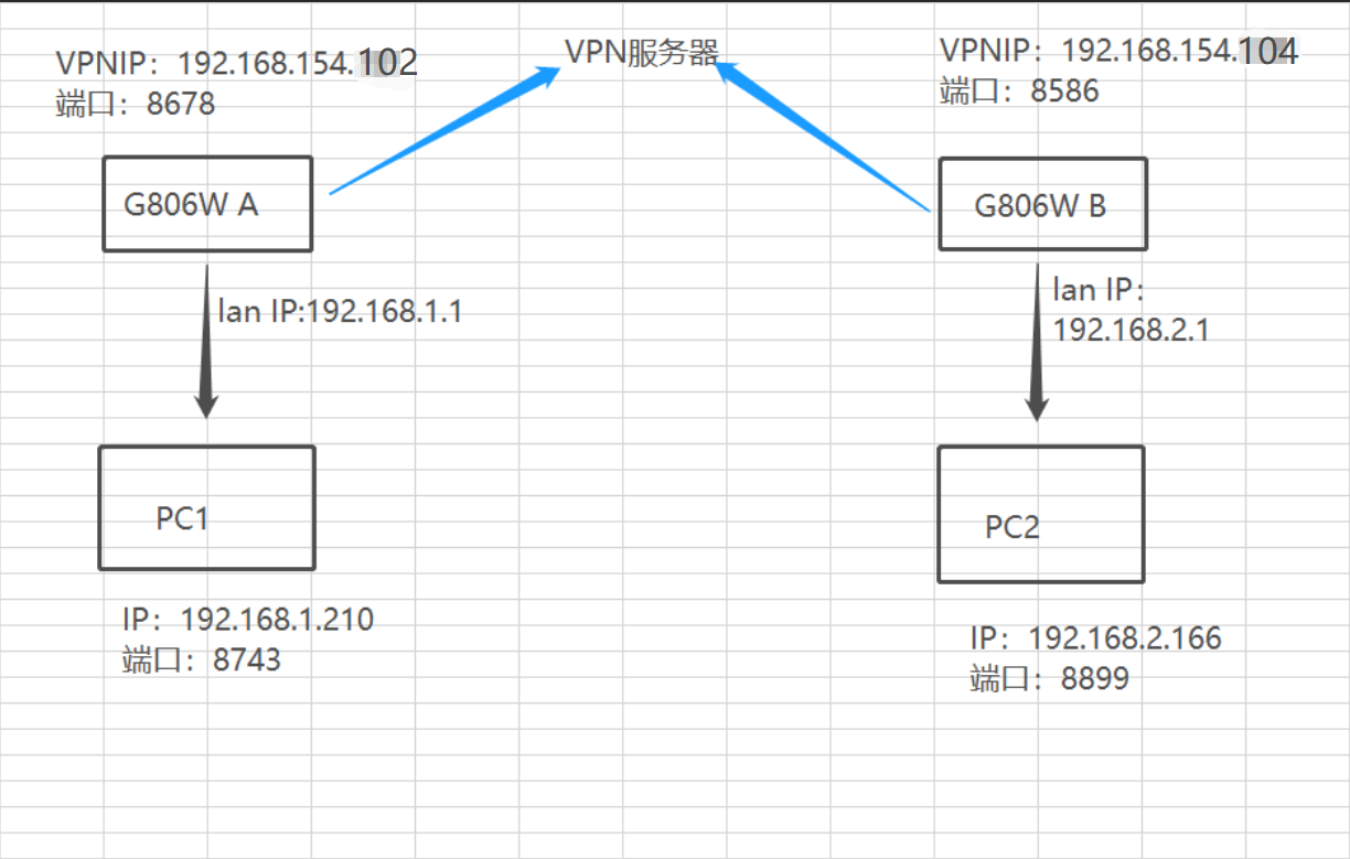 7>.到現(xiàn)在為止,兩臺G806W已經(jīng)連接上VPN了,連上同一個VPN服務器的客戶端之前可以相互訪問,所以現(xiàn)在VPN其他客戶端訪問G806W獲取到的VPN IP是通的,但是訪問不到G806W下的終端設備。所以就需要設置端口轉發(fā)或靜態(tài)路由,本案例設置的是端口轉發(fā)。需要G806W下的終端設置設備網(wǎng)關和DNS。