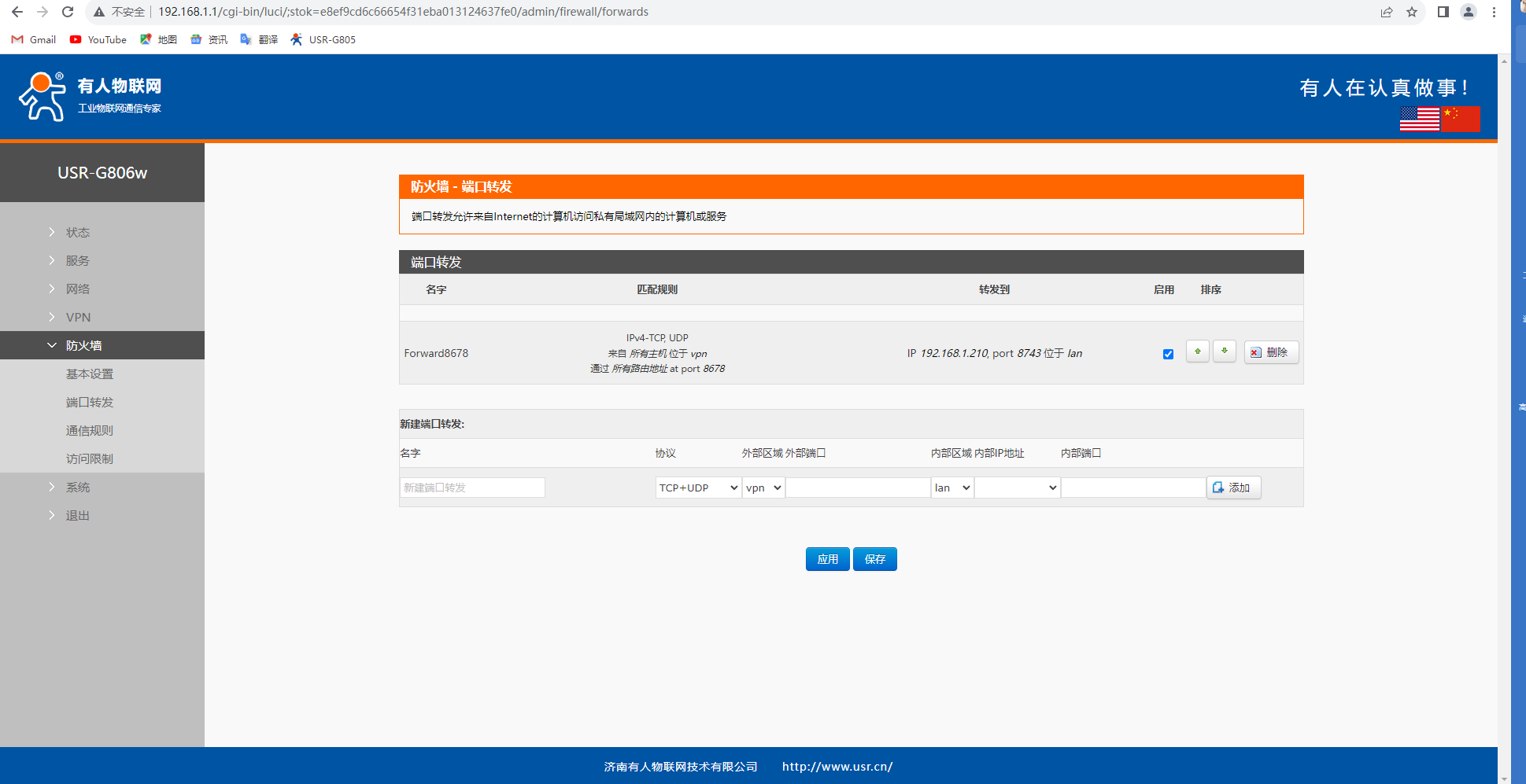 接下來設置端口轉發(fā)。在防火墻--端口轉發(fā)--新建端口轉發(fā)設置。名字自定義,選擇需要的協(xié)議和端口號,內部IP地址為本端的子網(wǎng)地址,也就是要把wan口數(shù)據(jù)轉發(fā)到的lan口地址。設置完成后點擊“添加”。