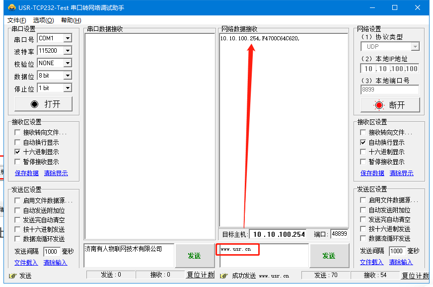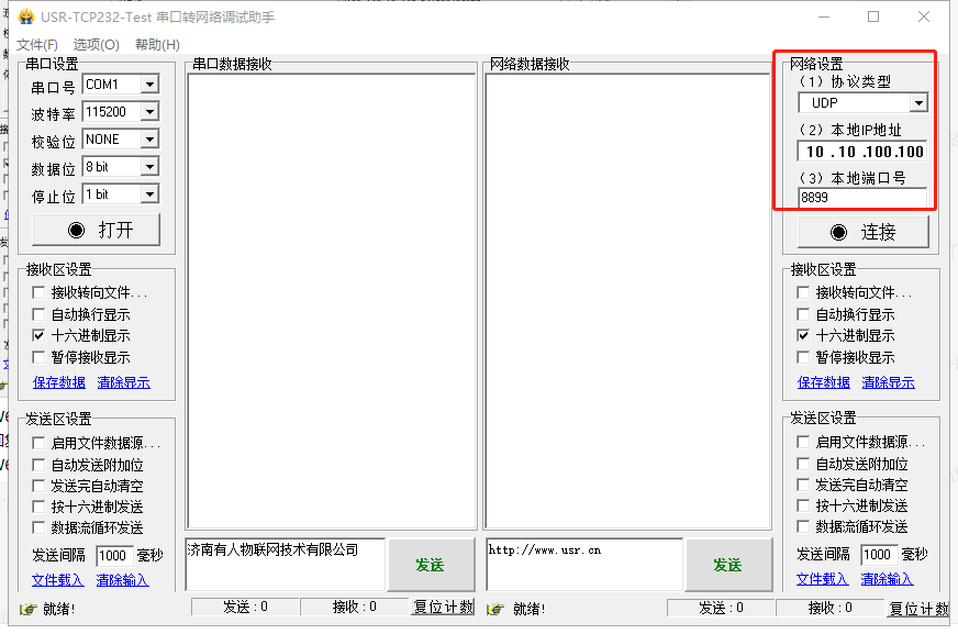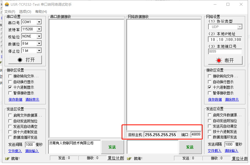 1.安裝并打開(kāi)USR-TCP232-TEST測(cè)試工具,設(shè)置右側(cè)網(wǎng)絡(luò)端協(xié)議為UDP,本機(jī)IP設(shè)置為電腦鏈接W610wifi獲取的IP地址