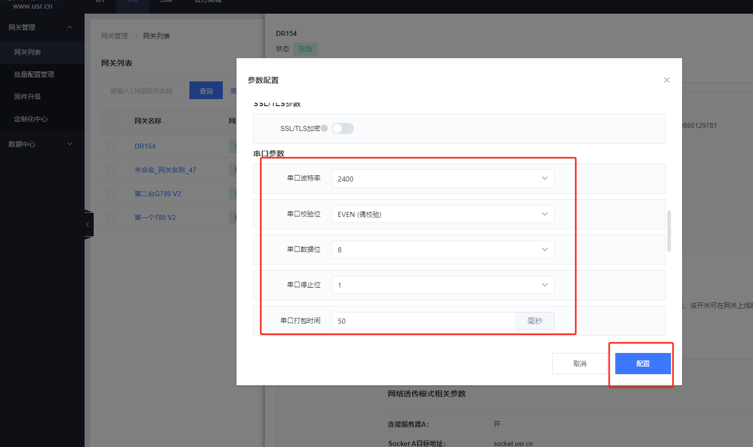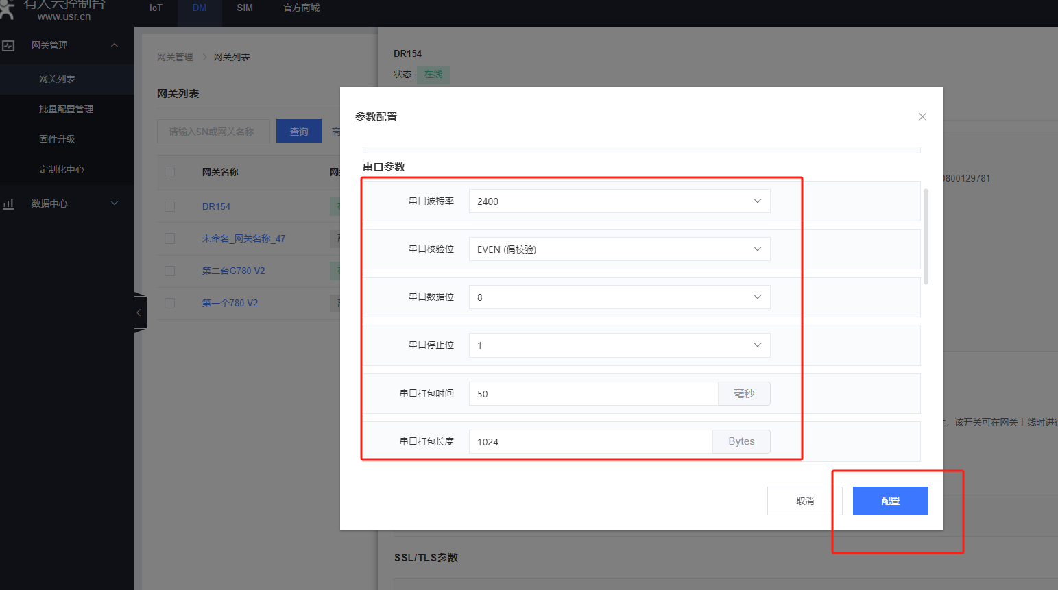 8.跳轉(zhuǎn)到DM平臺(tái),配置DR154的串口參數(shù)改成和要接的電表一致,電表串口波特率、校驗(yàn)、數(shù)據(jù)位、停止位是:2400,even,8,1,設(shè)置完點(diǎn)配置。