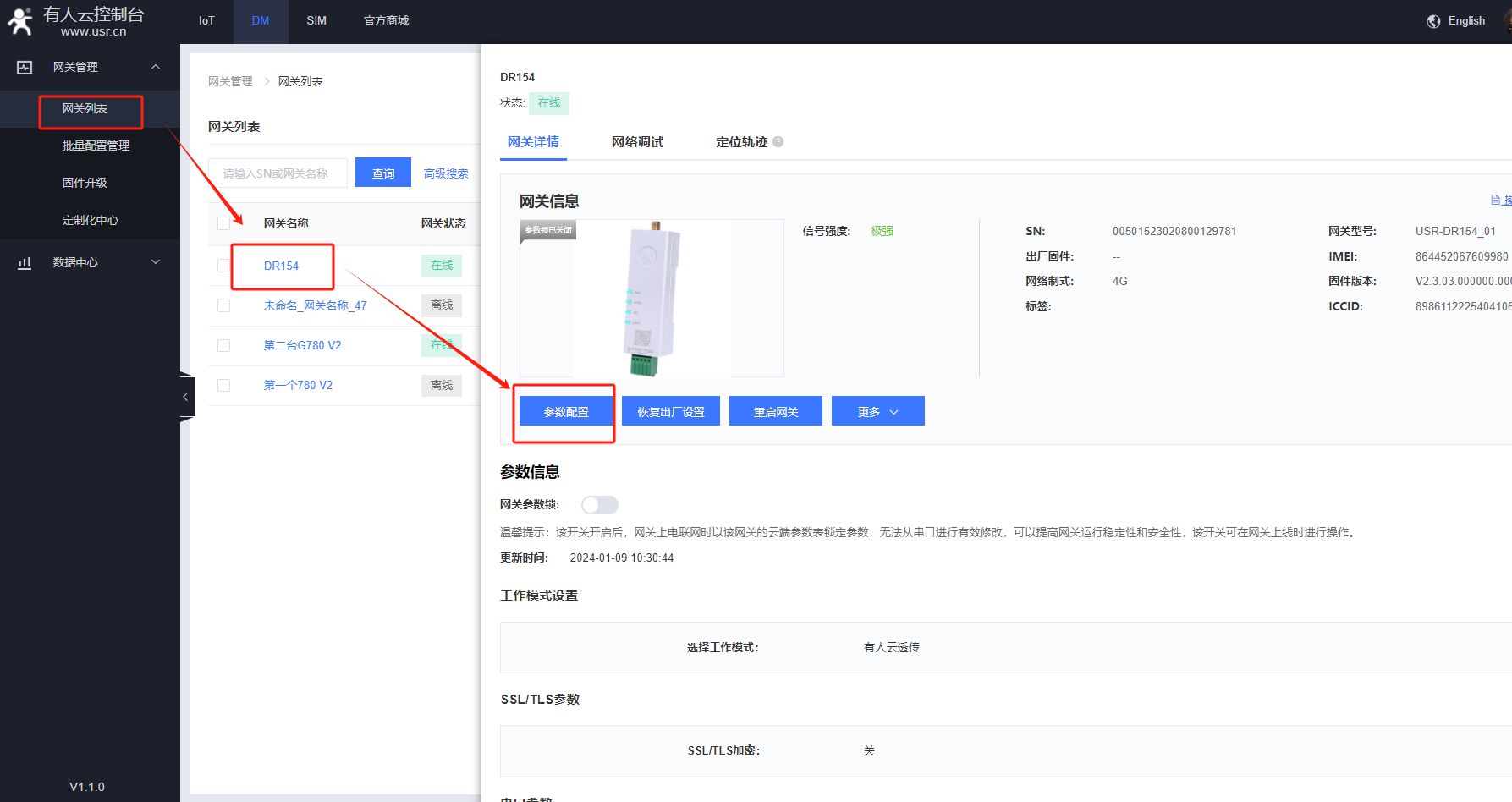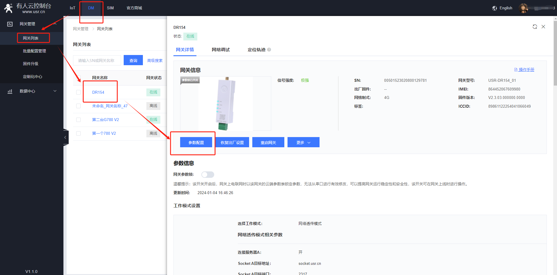 3.在DM平臺(tái)——網(wǎng)關(guān)列表——找到添加的154——參數(shù)配置,修改串口參數(shù)和要接的電表一致。