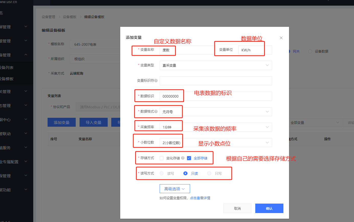 5.點(diǎn)擊添加變量——本次案例展示讀取電表度數(shù)的變量配置: