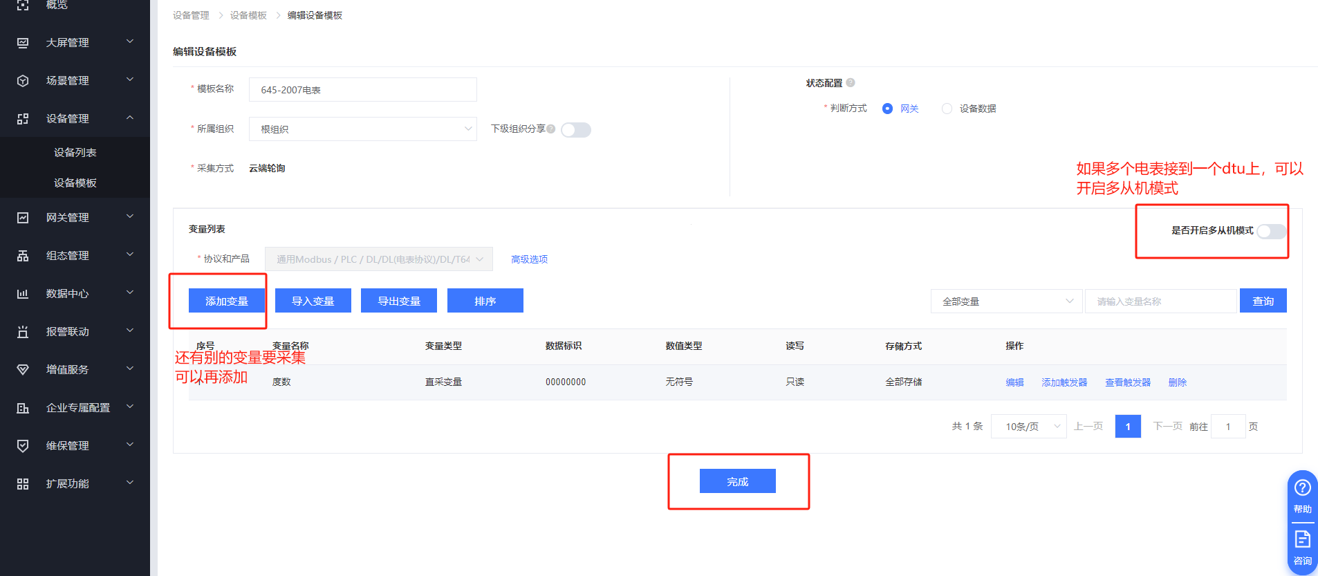 6.點(diǎn)擊確定生效(若還需采集該電表的其他數(shù)值,可繼續(xù)點(diǎn)擊添加變量。也可后期自行在瀏覽器左側(cè) 設(shè)備管理 - 變量模板 中選擇該模板進(jìn)行編輯添加變量,如果多個(gè)電表接到同一個(gè)dtu上,也可以開啟多從機(jī)),云設(shè)備添加成功。
