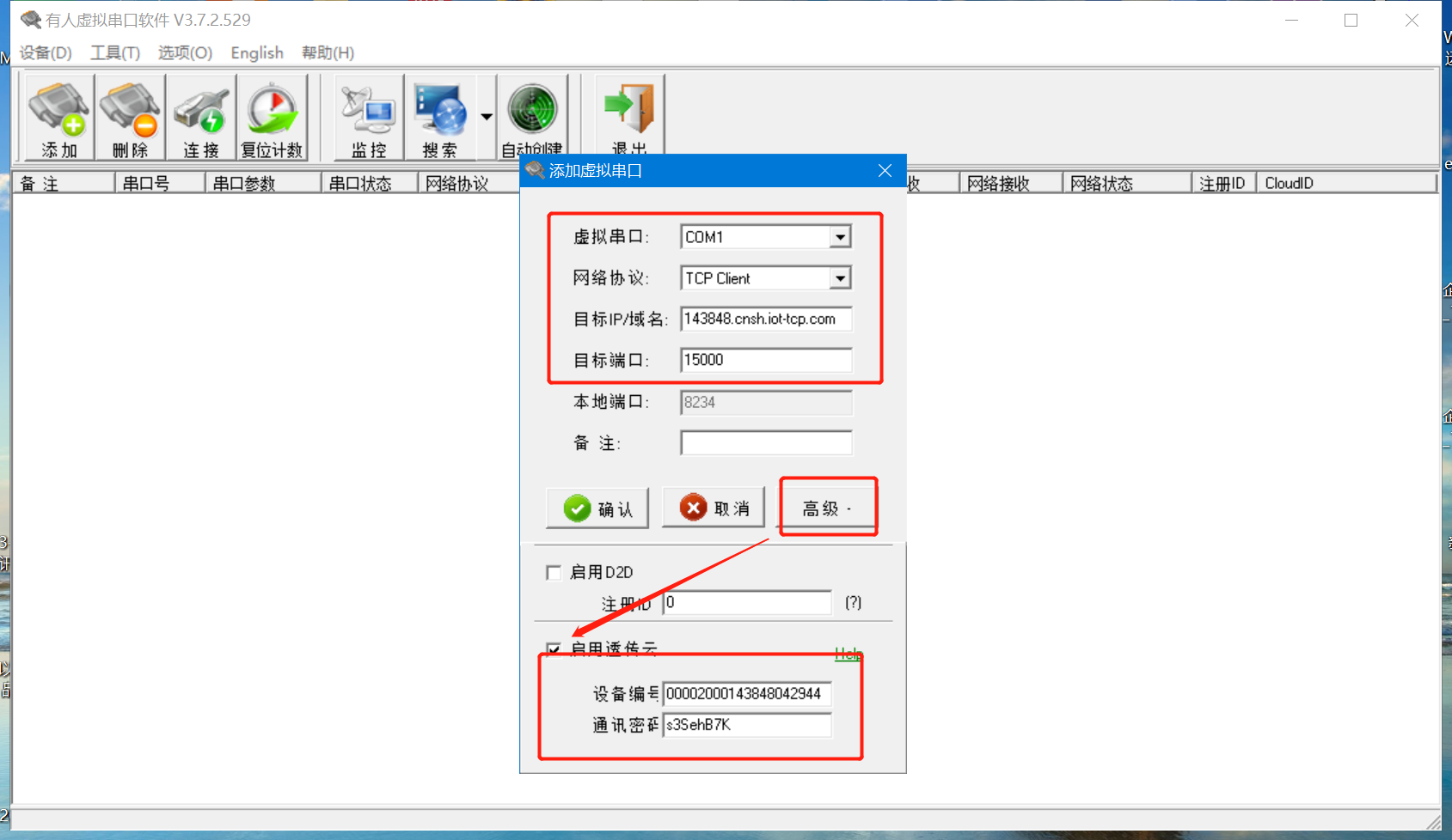 打開虛擬串口軟件,填寫接入地址以及sn和通訊密碼