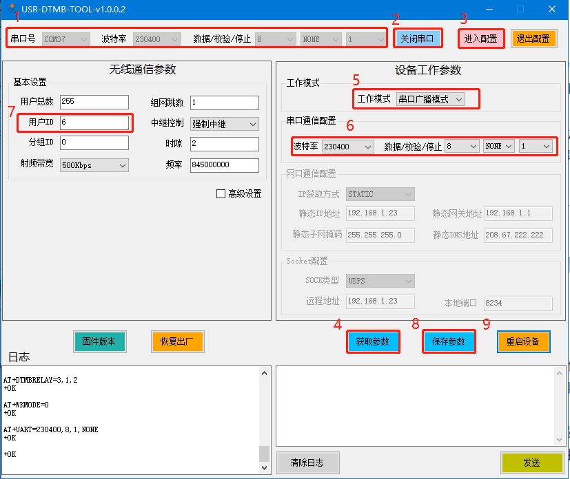 G. 點(diǎn)擊保存參數(shù),點(diǎn)擊重啟設(shè)備,點(diǎn)擊關(guān)閉串口。