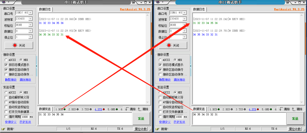 設(shè)備的兩串口分別用串口軟件打開可以測(cè)試數(shù)據(jù)相互透?jìng)鳌?/p>
