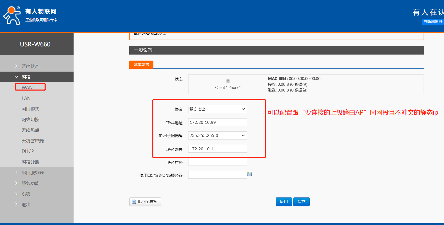 3、在“WAN接口”中,可以給W660配置一個(gè)靜態(tài)ip地址,注意要與上級(jí)路由AP在同網(wǎng)段的ip