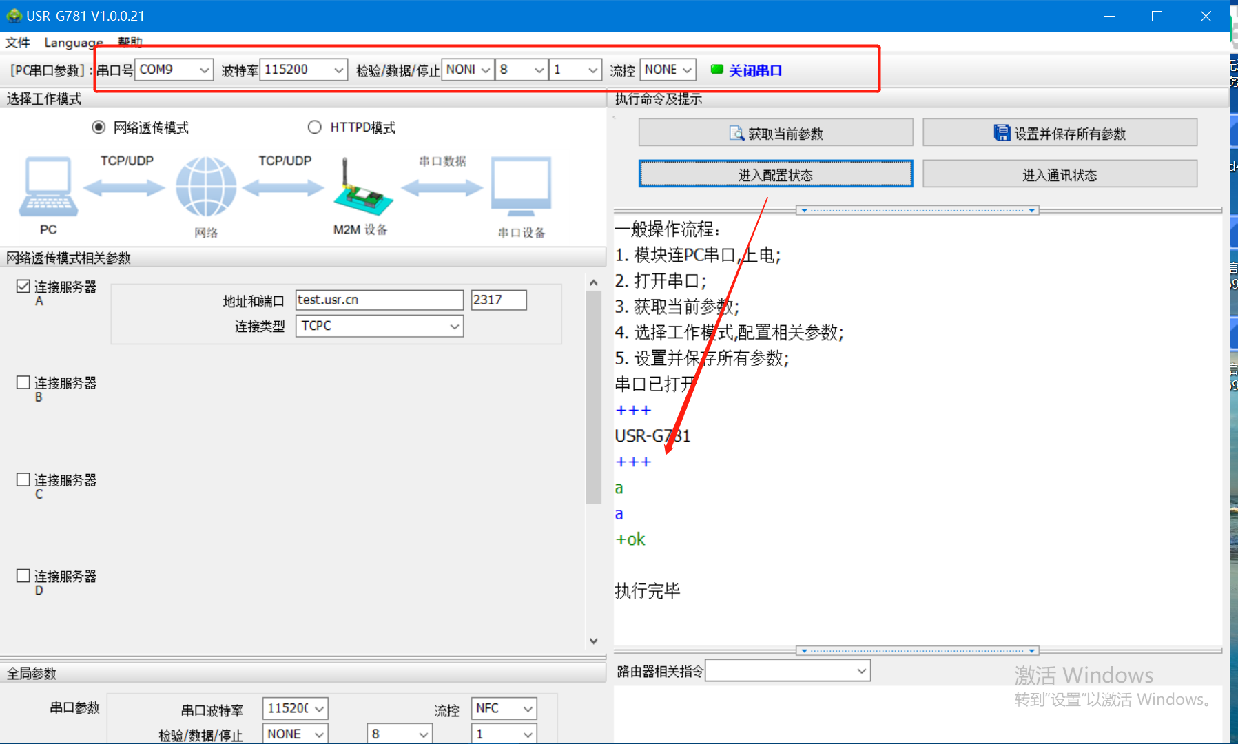 2、設備出廠默認波特率115200 NONE 8 1 打開串口,進入配置,設備回復OK