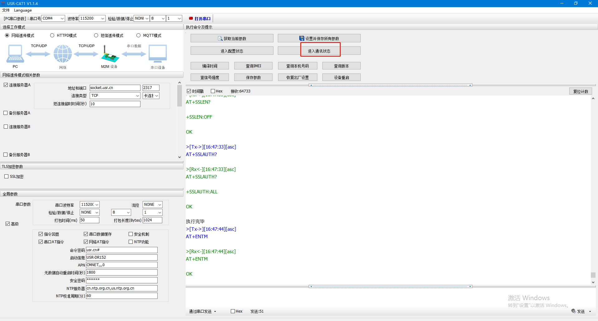 5、默認串口AT指令功能是開啟,不需要設(shè)置參數(shù),點擊進入通訊狀態(tài)就可以。如果需要修改參數(shù),最后才點擊設(shè)置保存所有參數(shù)。