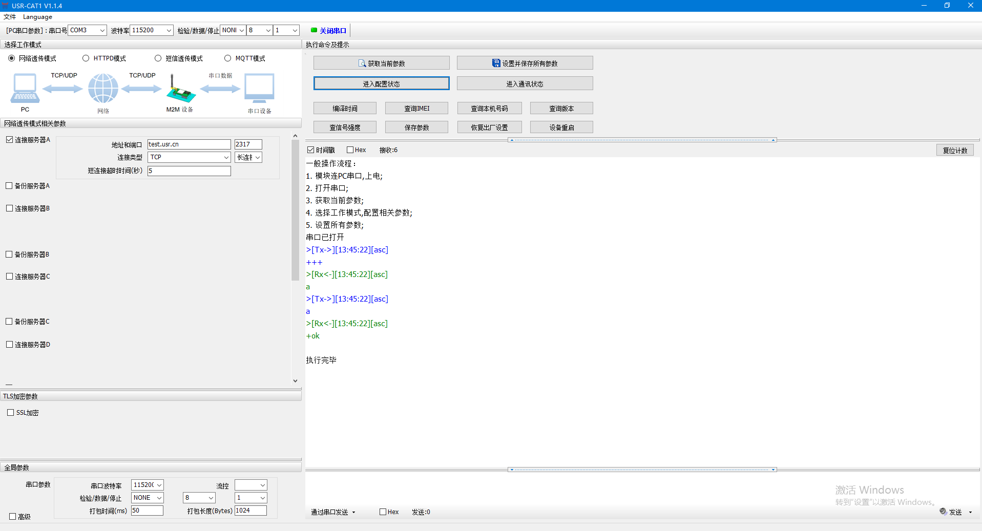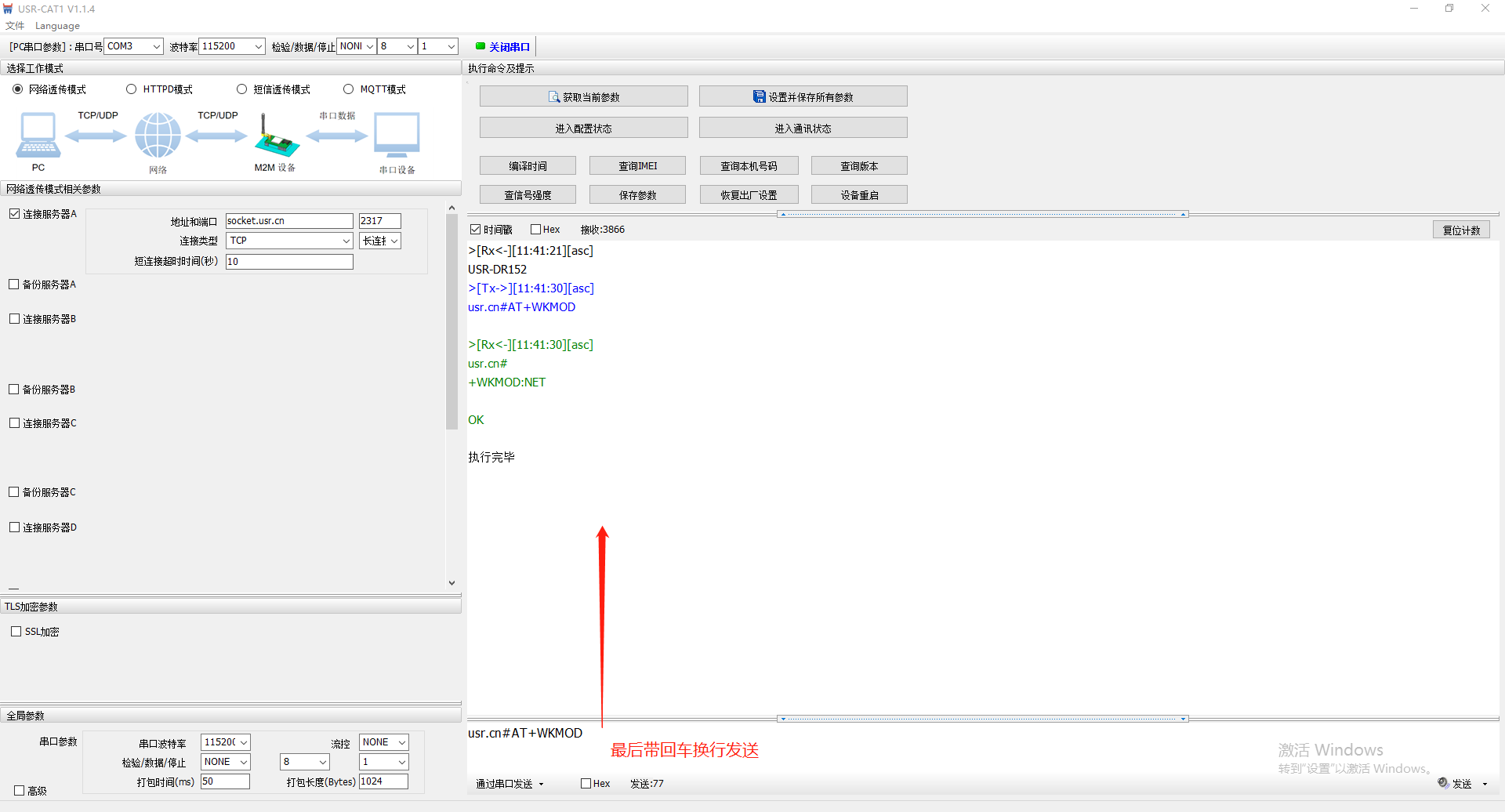在進入通訊狀態(tài)時,打開串口助手COM3,串口參數(shù)和USR-DR152串口參數(shù)設(shè)置一致,發(fā)送usr.cn#AT+WKMOD后面帶回車換行發(fā)送,串口可以查詢到工作模式。