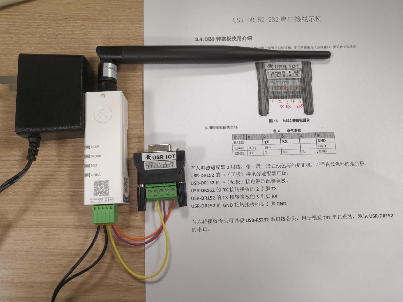 USR-DR152的232串口接USB-RS232串口線模擬232串口設(shè)備。